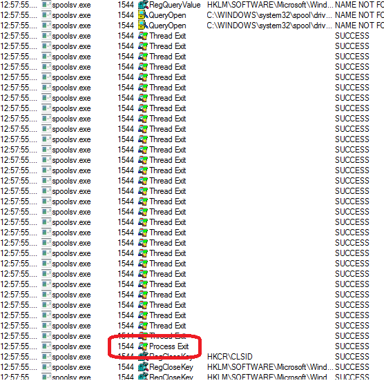 You can see here where the process is exiting. Now all I had to do was scroll up and see what it was doing just prior to the crash. Lo and behold I observed MANY lines referencing a particular printer and driver.