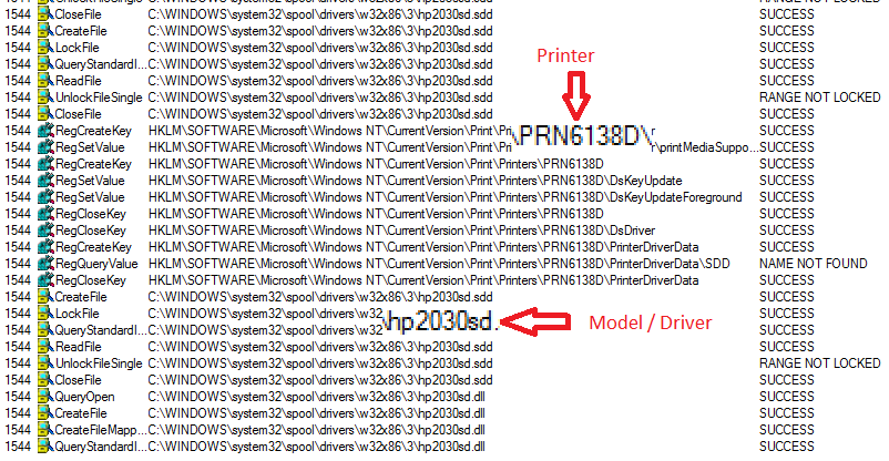 I had taken a break to drive home and eat dinner. So now it was quite late in the evening. I decided to call and open a ticket with Microsoft and continue to work on the problem while waiting for a callback from an engineer. After getting off the phone I finally turned to my #1 favorite Windows diagnostic tool….. Process Monitor. This tool was developed by Mark Russinovich and the Sysinternals team. They were acquired by Microsoft a couple years ago. Process Monitor captures all file system, registry, network and process activity on a system. I ran it until the spooler crashed. I then filtered to only show output which includes the spoolsv.exe process. I scrolled to the time of the crash and here’s what I saw.