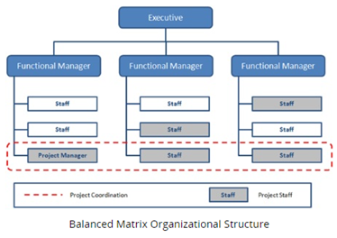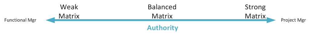 In between is the matrix structure, of which there are several levels. The term matrix implies dual reporting relationships. Staff have a functional manager and there are project managers. The balance of authority between the two determines the flavor of matrix.