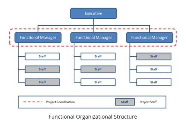 In the traditional functional structure, the organization is split up into departments based on business function. The staff report to functional managers, who in turn report to middle / upper management.