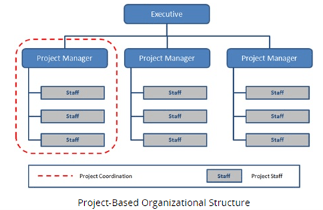 The other end of the spectrum is project-based or, as PMI calls it, projectized. This is the ideal structure for an organization whose business revolves around executing projects, i.e. a service provider. Instead of being aligned around functional departments, the staff are assigned to projects managed by a project manager. The PM has control of resources including staff and budget.